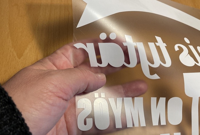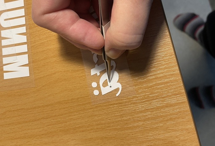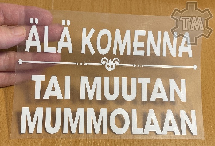 Käytämme painatuksissa laadukkaita lämpösiirtomateriaaleja. Nämä eivät ole silitysraudalla kiinnitettäviä ”tulostuskuvia”, vaan laadukkaita ja kestäviä vinyylipohjaisia kalvoja, joiden työstämiseen käytetään ammattikäyttöön tarkoitettuja työvälineitä (leikkureita ja lämpöprässejä). Leikkuri leikkaa kalvoon ääriviivojen mukaisia kuvioita (kirjaimia), joista sitten käsin poistetaan ne osat, joita ei haluta mukaan painatukseen.