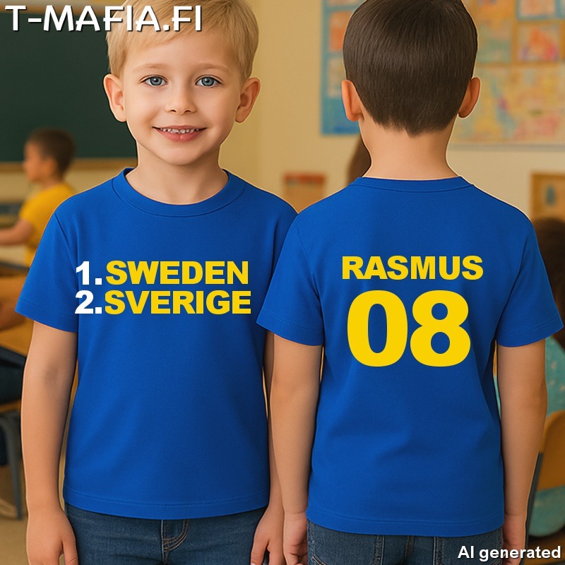 Suomi tai Ruotsi T-paita lapselle omalla nimellä ja numerolla (FOL)