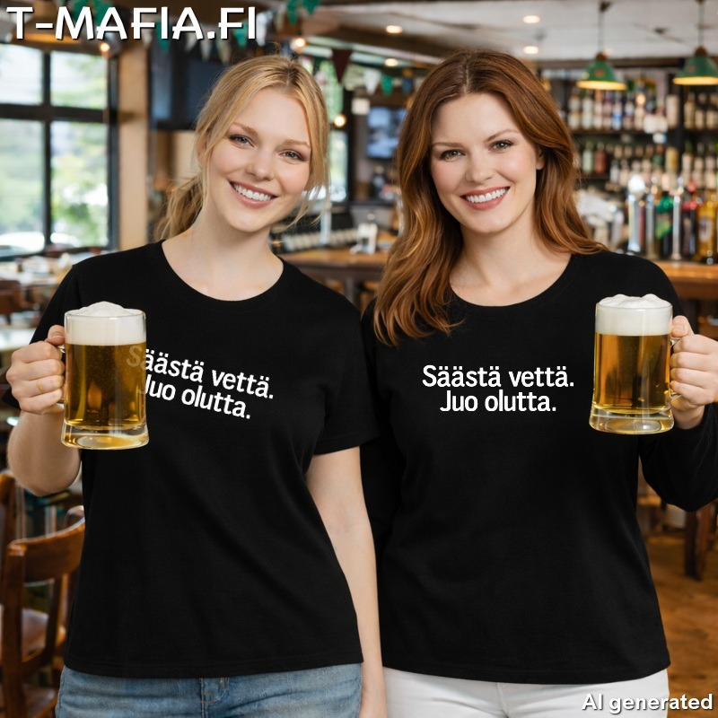Rento ja humoristinen T-paita, joka ei turhia selittele. Teksti “Säästä vettä. Juo olutta.” tuo hymyn huulille ja kertoo kantajansa asenteesta pilke silmäkulmassa.