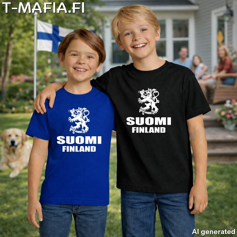 Tekstit Suomi ja Finland, sekä klassinen leijonan kuva. Kuva suhteutetaan paidan kokoon.