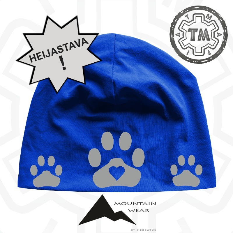Heijastavia tassun ja sydämen kuvia pipossa. Heijastavia kuvia on myös pipon takana tuomassa lisänäkyvyyttä.